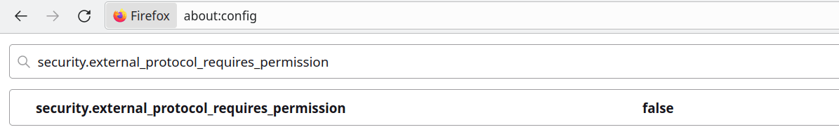 搜索框输入 security.external_protocol_requires_permission ,默认值为 true ,双击搜索结果,改为 false 。
