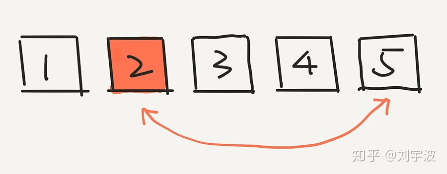 那么,根据这个算法,首先会在这五个元素中选一个元素,和最后一个元素 5 交换位置。假设随机出了 2。