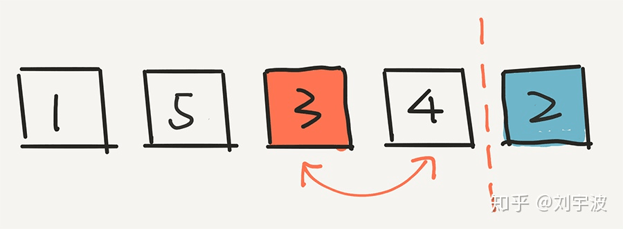 下面,根据这个算法,就已经不用管 2 了,而是在前面 4 个元素中,随机一个元素,放在倒数第二的位置。假设我们随机的是 3。3 和现在倒数第二个位置的元素 4 交换位置。