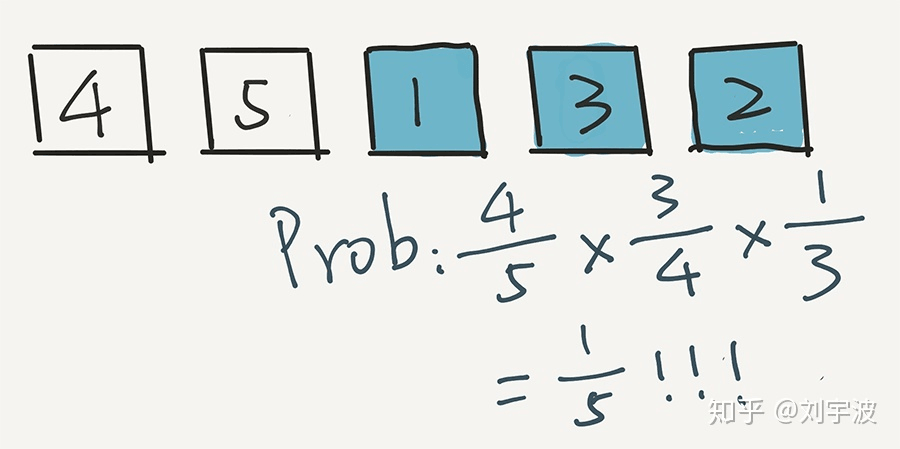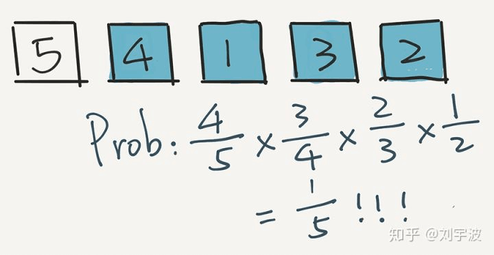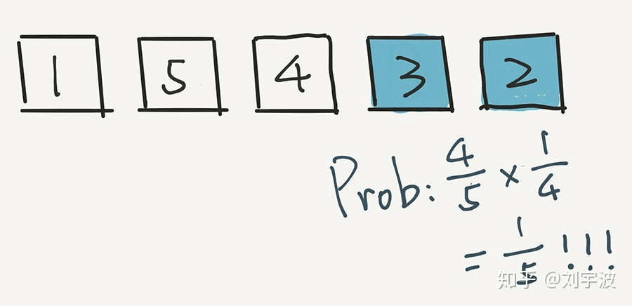下面,计算 2 出现在最后一个位置的概率是多少?非常简单,因为是从 5 个元素中选的嘛,就是 1/5。实际上,根据这一步,任意一个元素出现在最后一个位置的概率,都是 1/5。